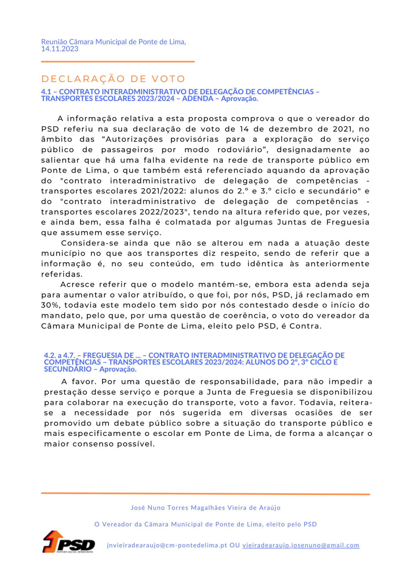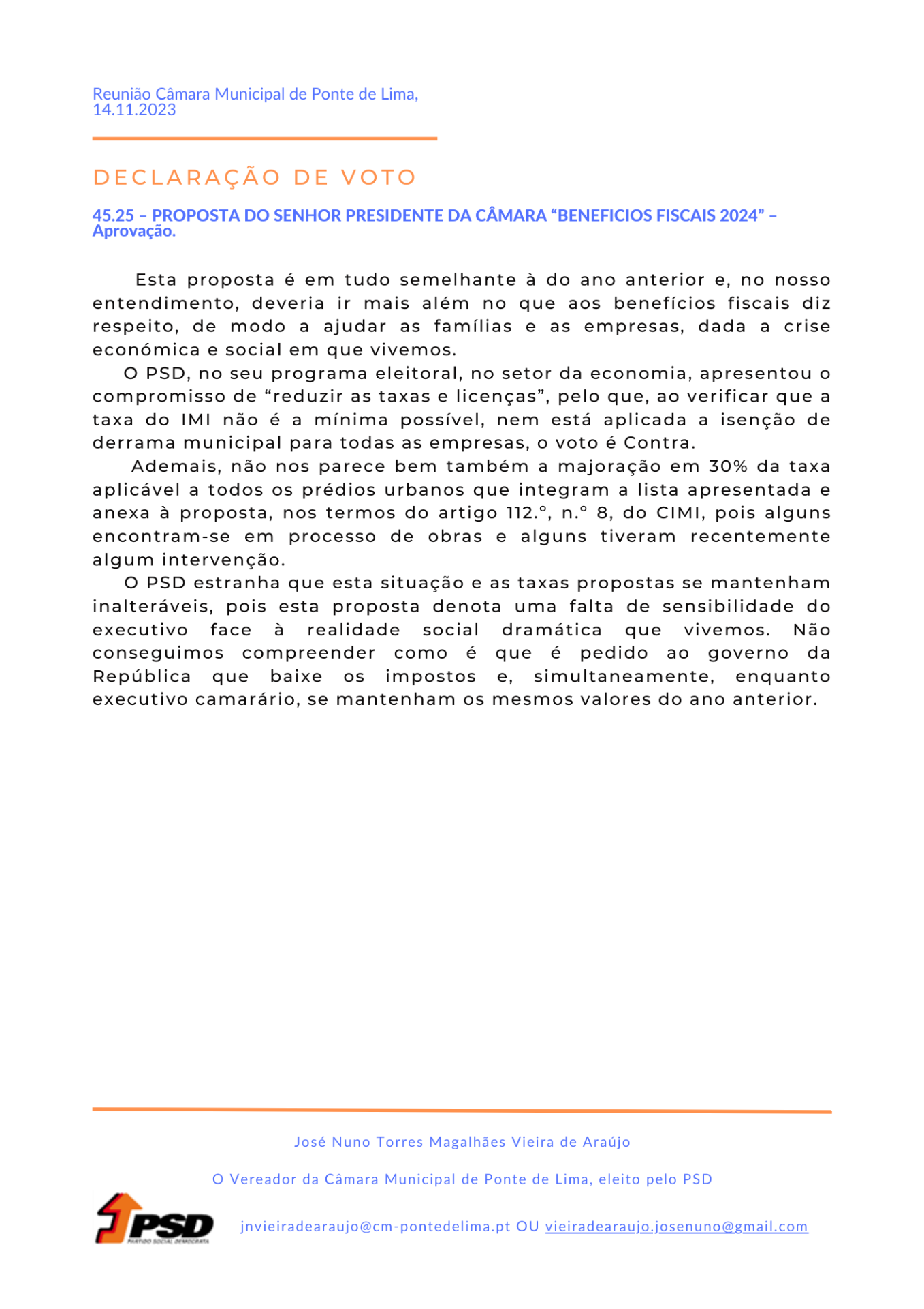 Face à proposta apresentada, e porque, de facto, este não é o nosso projeto político, o voto do vereador da Câmara Municipal de Ponte de Lima, eleito pelo PSD é: